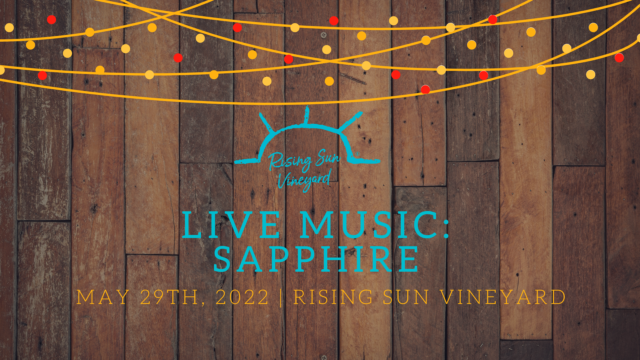 Join us at Rising Sun Vineyard and listen to live music with Sapphire! Enjoy your time under our covered pavilion while sipping on wine and listening to live music. We…